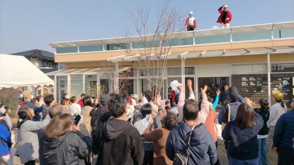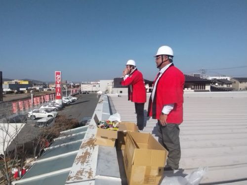 西バイパス店の屋根の上から藤本社長や尾崎部長が餅やお菓子をこれでもかと投げ込みます!