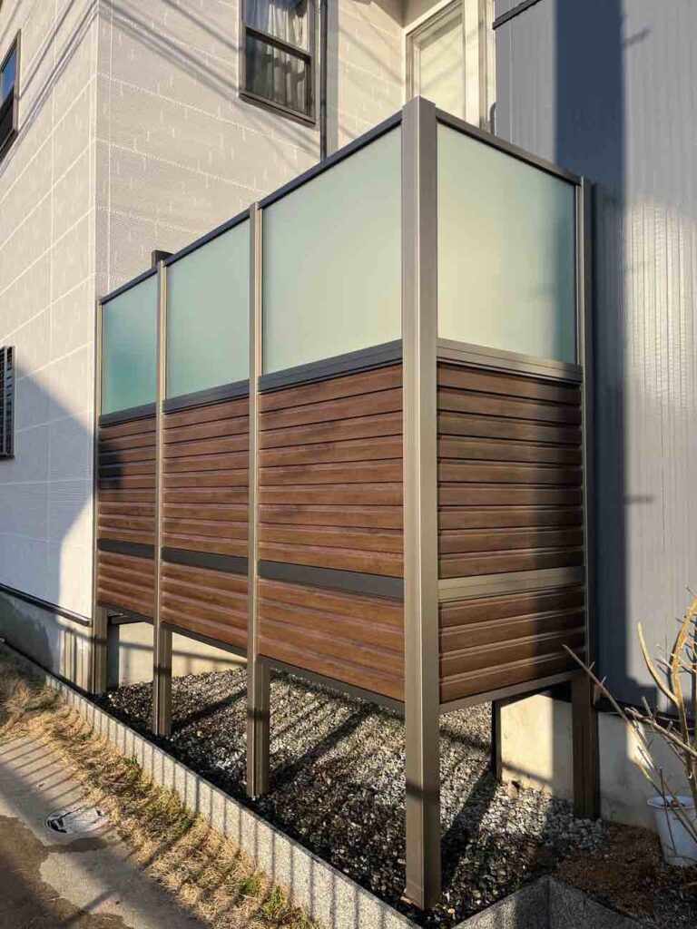 下段はしっかり目隠しできる木調パネルですが、上段には採光性の高い「すりガラス調(ポリカーボネート)」のパネルを組み合わせました。