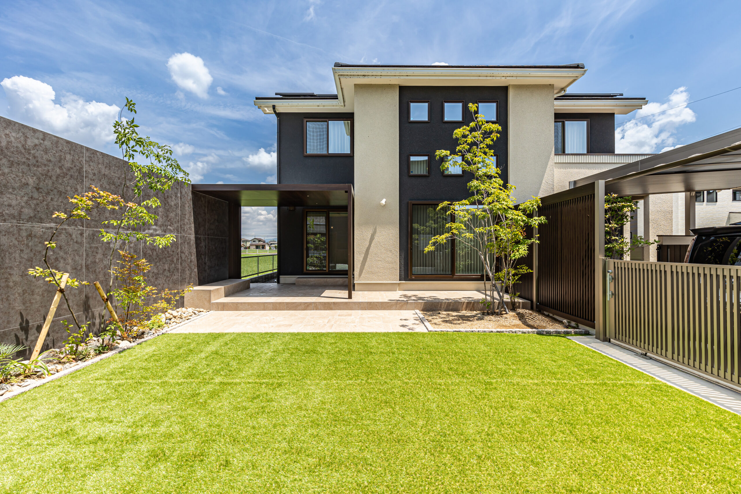 広い敷地をメンテナンスが楽な空間へ。人工芝とタイルでローメンテナンスを実現しながら、お子様が走り回れる庭に。LIXILのプラスGで目隠しし、華やかな植栽を配置。草取りの時間より、植栽のお手入れを楽しむ、家族で過ごせる空間づくり。
