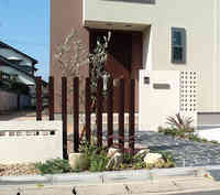 こんにちは〜エクステリア&ガーデンプランナーの久保です。こちらはナチュラルモダンのイメージの外構です、ポイントは木目調のアルミ柱のスリットフェンスとロックガーデンを組み合わせたエントランスです。ブラック天然石がアクセントになって、建物にマッチした開放的な外構の完成です。