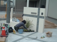 つくしが顔をだしたというのに、なかなか上着が脱げない、ガーデンプランナーの久保です。皆さんこの写真を見て、気づいてもらえましたか〜?門柱のクロスデザインが車庫まで伸び、今度は車庫のデザインになっているんですよ〜斬新でしょ!ガーデナー三村さんがセンス良く丁寧に植え込み中です!