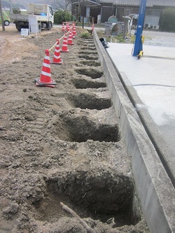 玉野市で目隠しフェンス施工中の現場にきています。施工場所は、廻りが田んぼで、風が強く、フェンスが飛ばされないに、柱の基礎を大きくして、コンクリートを沢山入れて補強!柱も1mの間隔で設置していきます。現場によって、施工マニュアルが変わります。