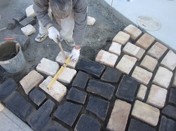 駐車場の床面に、黒や薄いベージュの耐火レンガをひとつひとつ丁寧に敷いていきます。水平器で高さを調整しながら仕上げていきますよ!