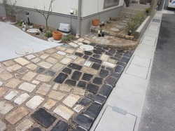 そして完成した写真がこちら、さまざまな色合いの耐火レンガを組み合わせて、お洒落な車庫スペースができあがりました。角が落ちて丸みを帯びるのも耐火レンガの特徴です。耐火レンガの草目地から芽吹くグランドカバーが楽しみです!