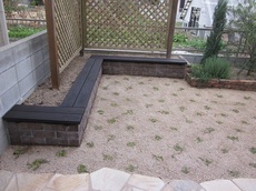 只今施工中の現場を紹介します。ウッドパーゴラをコーナーに設置して、ラチスを取付。落ち着きのあるレンガ花壇にタンモクウッドを取付して、腰掛けれるベンチを造りました。そして、ラチスにクライミングローズ”ロココ”のピンクとアルバメイディランド(ホワイト)を植えこむ予定です。床面には、ヒメイワダレソウ(リピア)を植えています。完成が待ちどうしいですね!