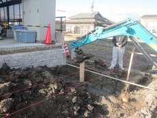 岡山市南区で造成工事中の現場にきています。既設のブロックを解体して、敷地を少し広げます。田んぼに土留ブロックをする為、基礎が下がらないように、松杭を打ち込んで、栗石を敷き、コンクリートをしっかり打ちこんでいきます。