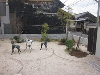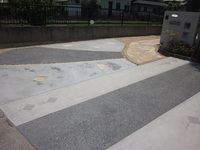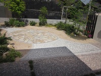 そして、出来上がった写真がこちら、お洒落なサークルとアプローチが完成しました。緑に覆われたお庭に合っていて、防草対策にもなりますよ。