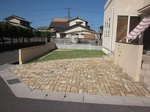 施工現場紹介します、お洒落な耐火煉瓦と姫高麗芝を組み合わせて、来客用車庫を造作。古煉瓦の風合いが出ていい感じに仕上がりました。施工前は水が溜まって、お客様もお困りだったのですが、煉瓦を敷く事により、悩みも解消!お客様にすごく喜んで頂いております。