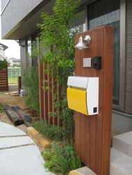 お馴染みのアイアンウッドで造作した門柱。ステンカラーの照明と表札、イエローのポストを組み合わせ、門廻りを際立たせました。