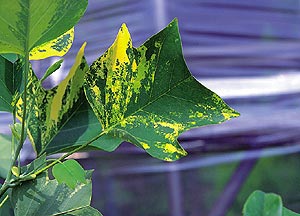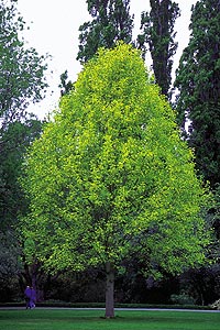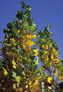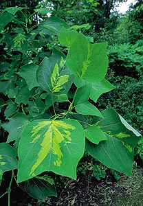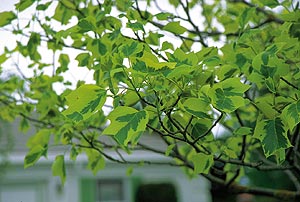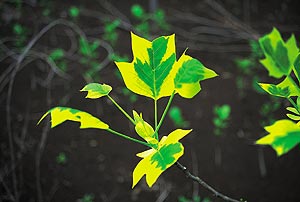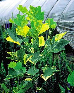 ●ユリノキの黄覆輪種。萌芽と同時に樹冠を鮮やかに飾る。斑は次第に薄れてくる。